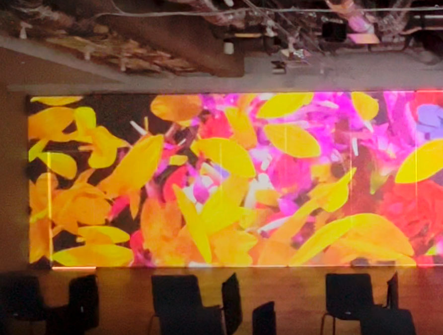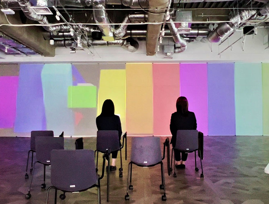 小さなビジュアルからスタートし、次第にモーショングラフィックと壁面へのマッピングで展開、さらにその中で、スローガンや写真で内定者へのメッセージを演出いたしました。カラーリングは「Diversity/多様性」を表現しています。